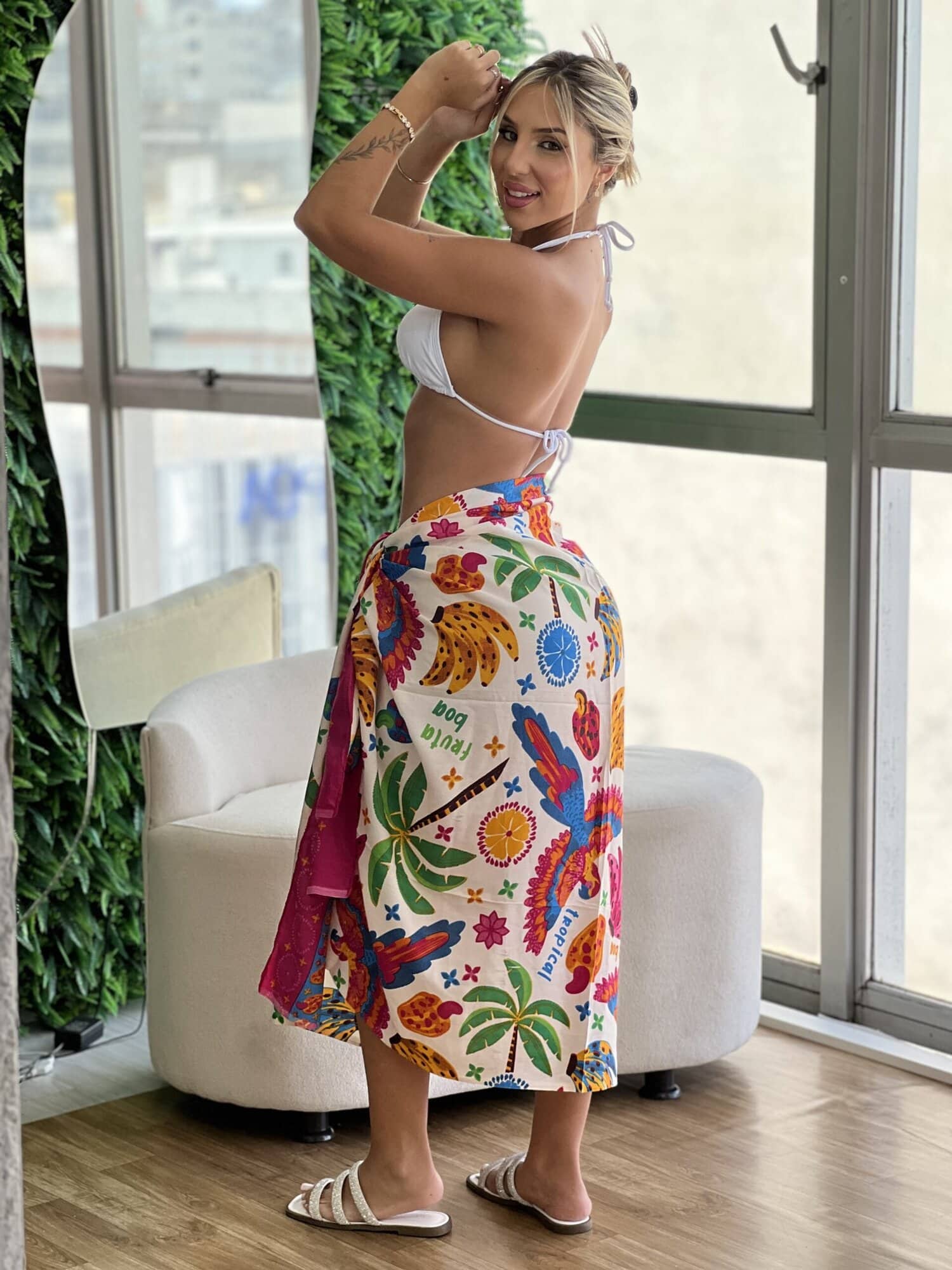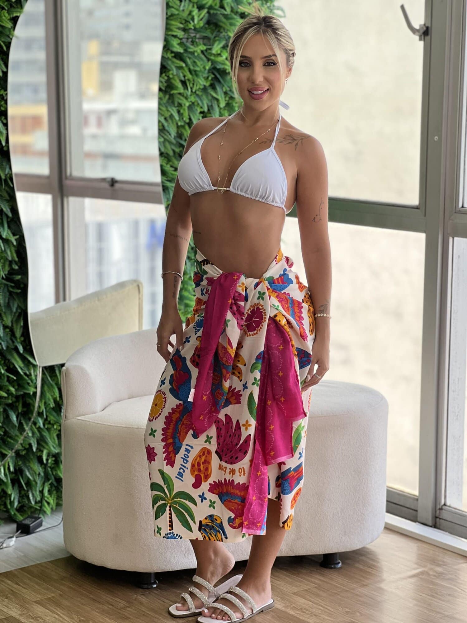 A linha Moda Praia Glamourosa Chic oferece conforto para mulheres de forte personalidade, que não abrem mão de estarem sempre glamourosas e deslumbrantes. Seja em praias ou piscinas, aposte nesta composição perfeita para usar com seu conjunto de verão. Utilize sua criatividade e faça diversas amarrações diferentes.