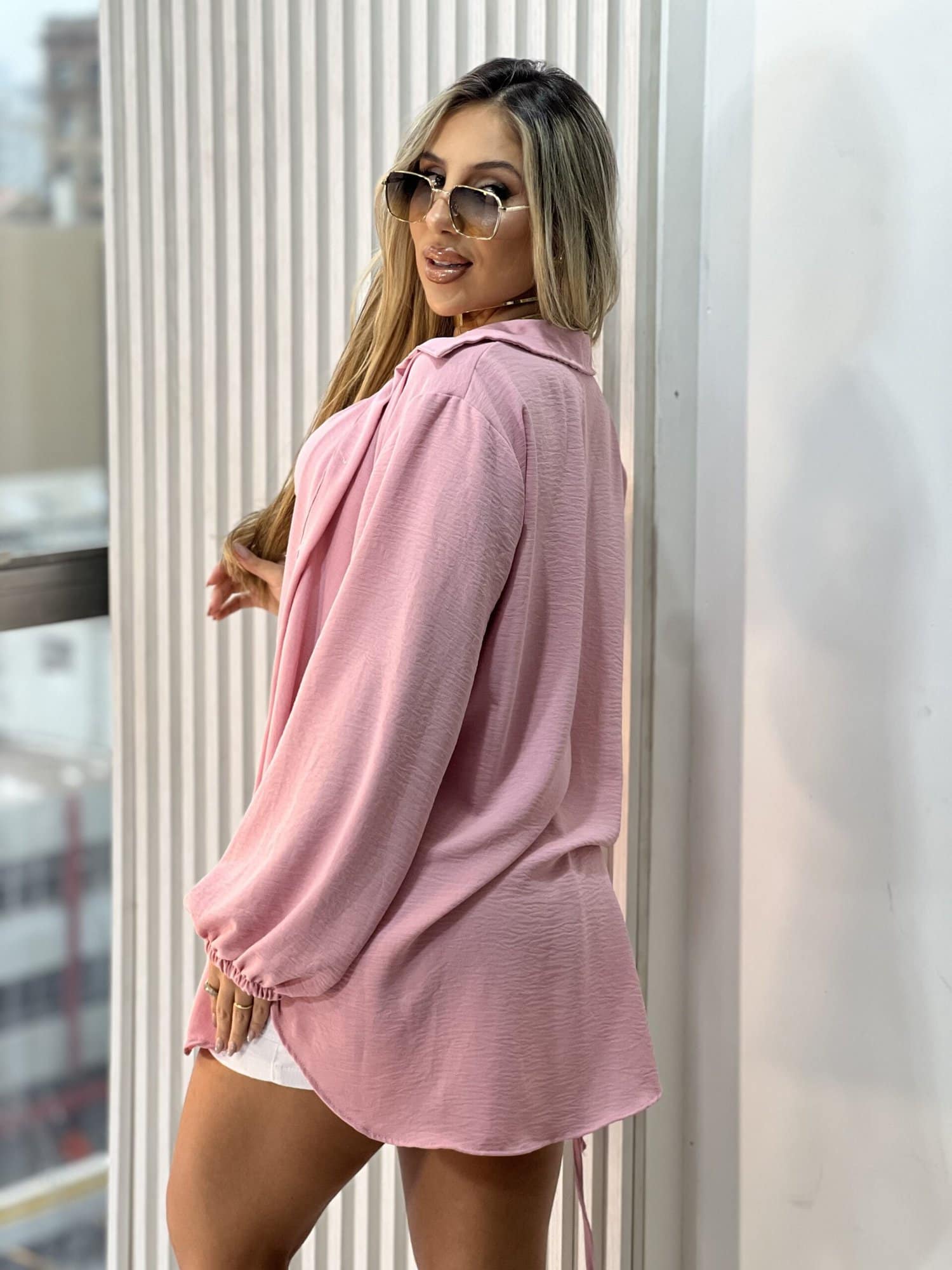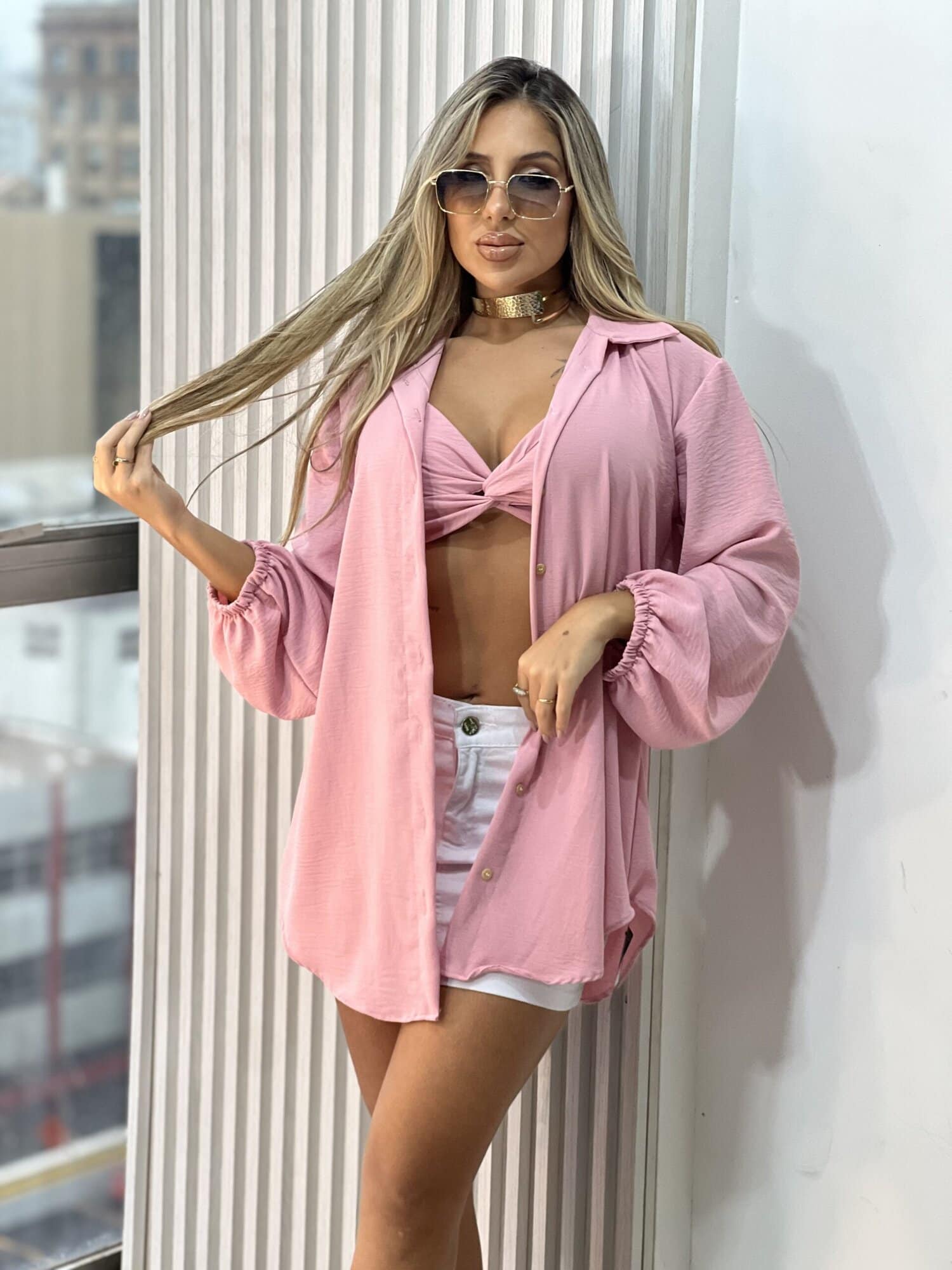 Conjunto top e chemise alongada podendo usar separadamente. E você pode usar só Chemise com cinto ou também deixá-la solta num estilo mais despojado. Outra dica também é usar como saída de praia, coloque seu biquíni por baixo e arrase. Top pode ser usado só ele com saia jeans, shortinho até mesmo com uma calça.