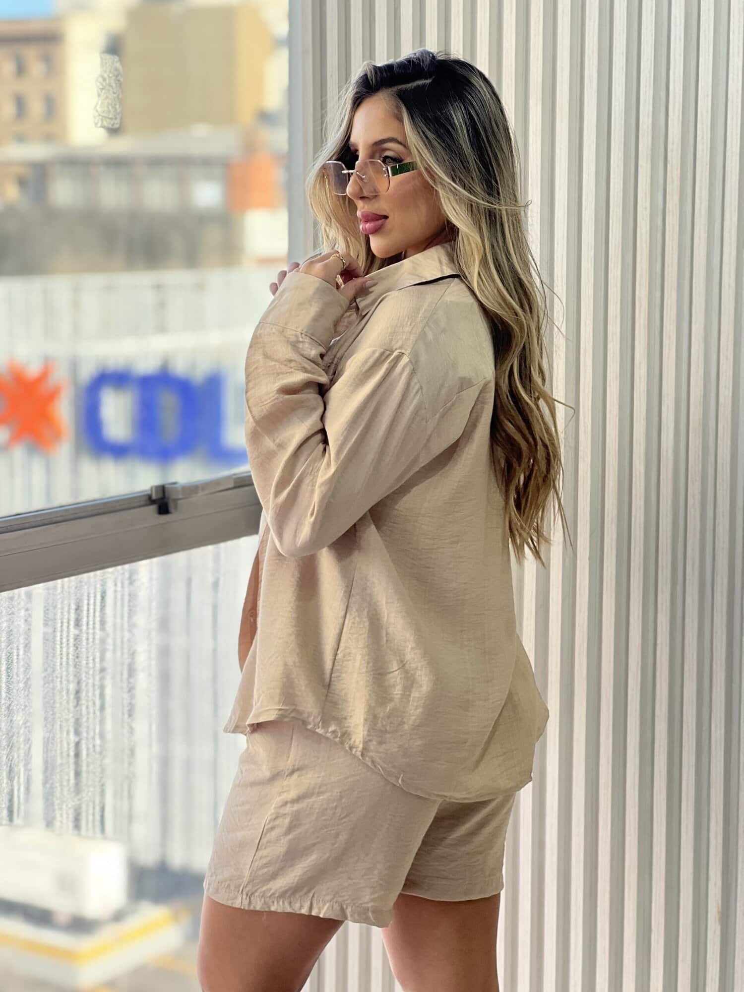 Conjunto confeccionado em viscolinho, composto por camisa e bermuda. A camisa possui bolso frontal e fechamento por botões, trazendo praticidade e estilo. A bermuda tem corte social, com passantes para cinto, fechamento por zíper e botão, além de bolsos frontais funcionais. Um conjunto leve, elegante e versatil, perfeito para composições modernas.