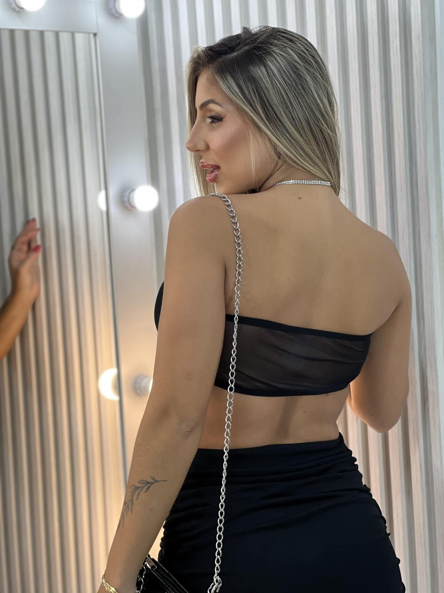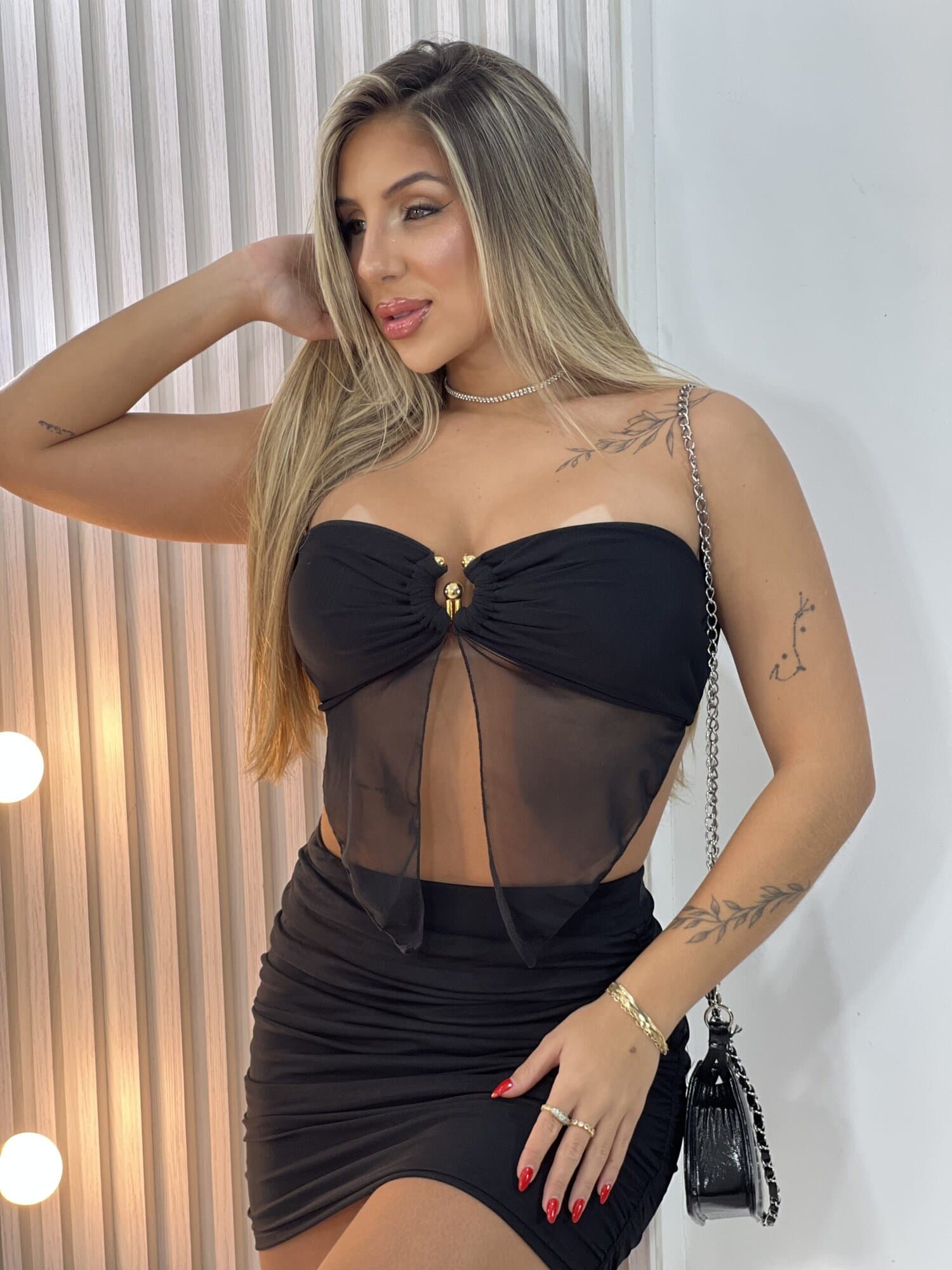 Conjunto sofisticado composto por cropped tomara que caia com bojo, acabamento em tule e bico, e detalhe entre os seios, que trazem charme e elegância ao look. A saia em tule drapeada nas laterais conta com forro duplo e elásticos na cintura, garantindo conforto e caimento perfeito. Ideal para festas, eventos especiais ou ocasiões que pedem um visual moderno e delicado.