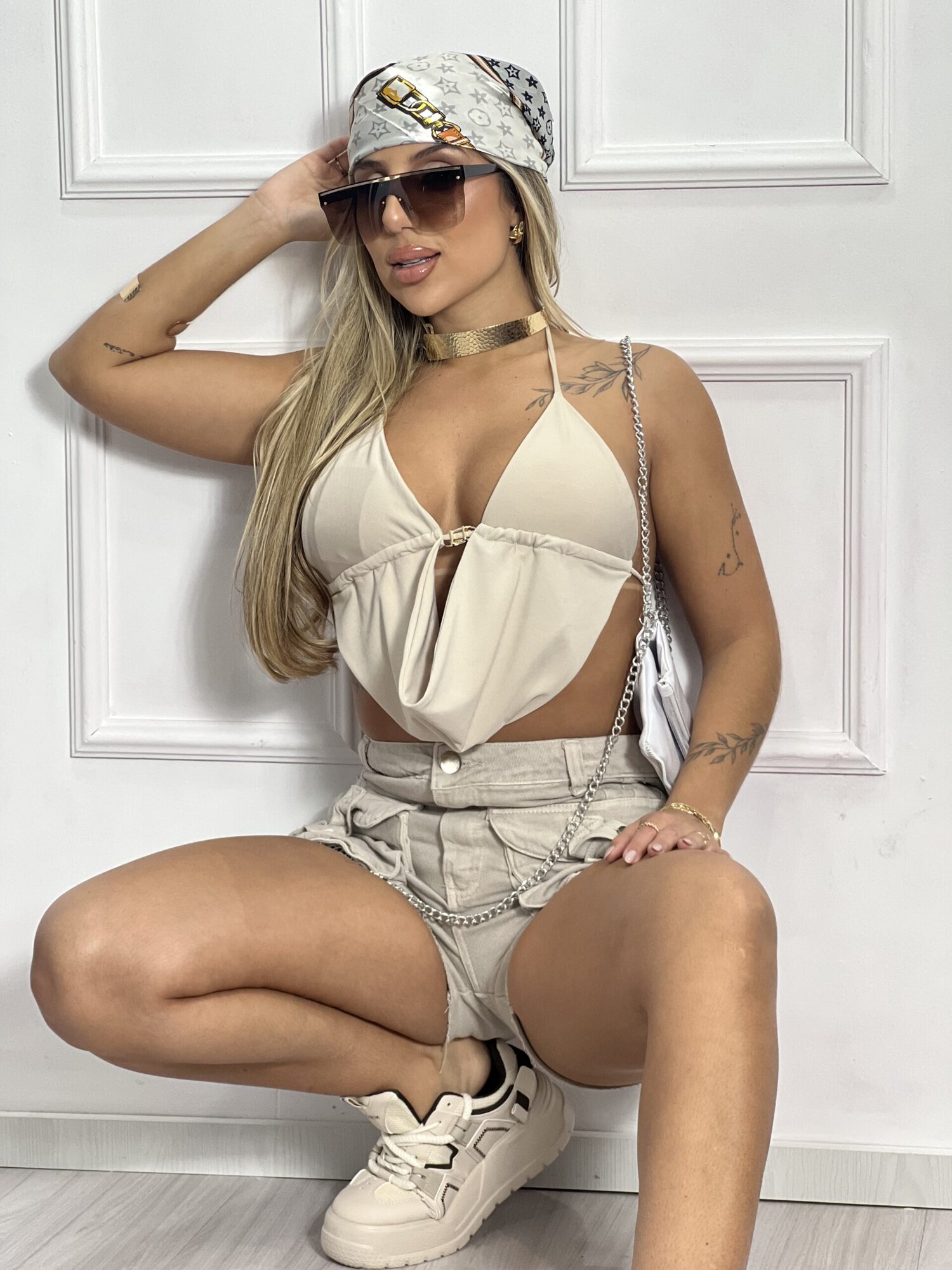 Cropped blogueira frente única, com amarração no pescoço e nas costas que garante ajuste perfeito ao corpo. O modelo não possui bojo e conta com detalhe em metal entre os seios, trazendo um toque moderno e sofisticado. Ideal para compor looks estilosos em ocasiões casuais ou festivas.