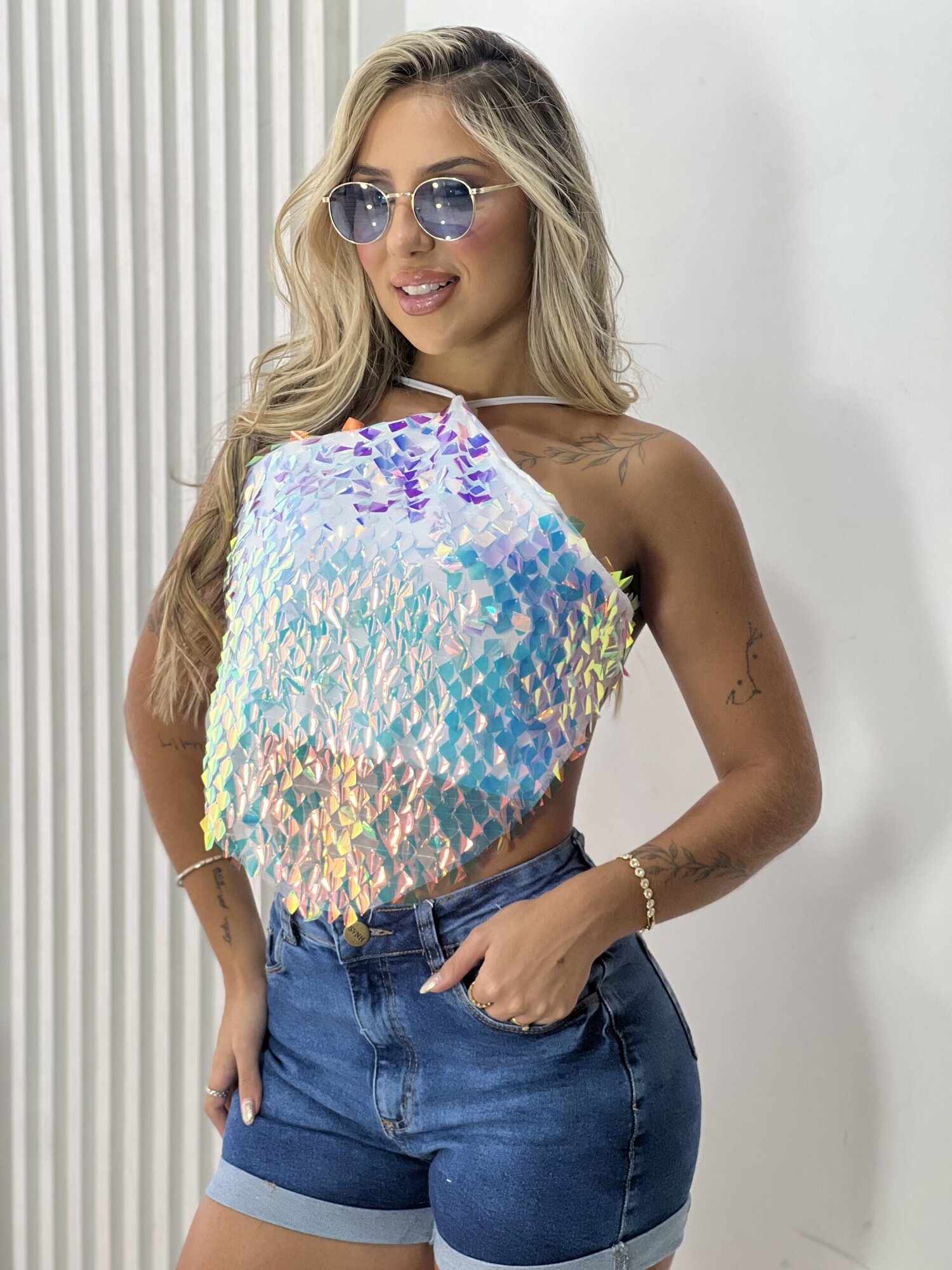 - cropped estilo paetê (pedacinhos de plástico espelhado furtacor);