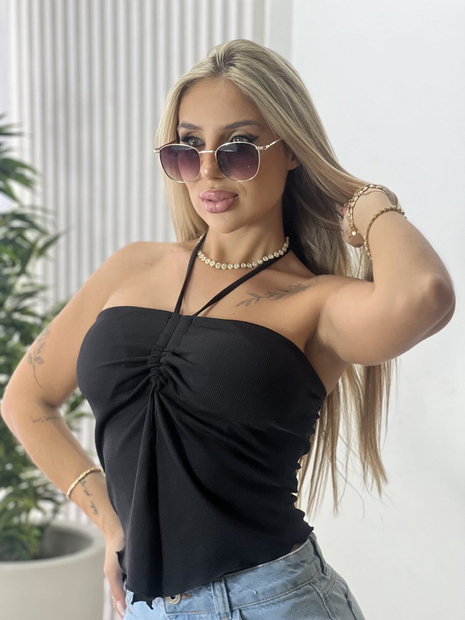 Cropped com acabamento em bicos, bojo estruturado e fenda frontal, criando um visual moderno, feminino e cheio de personalidade ”