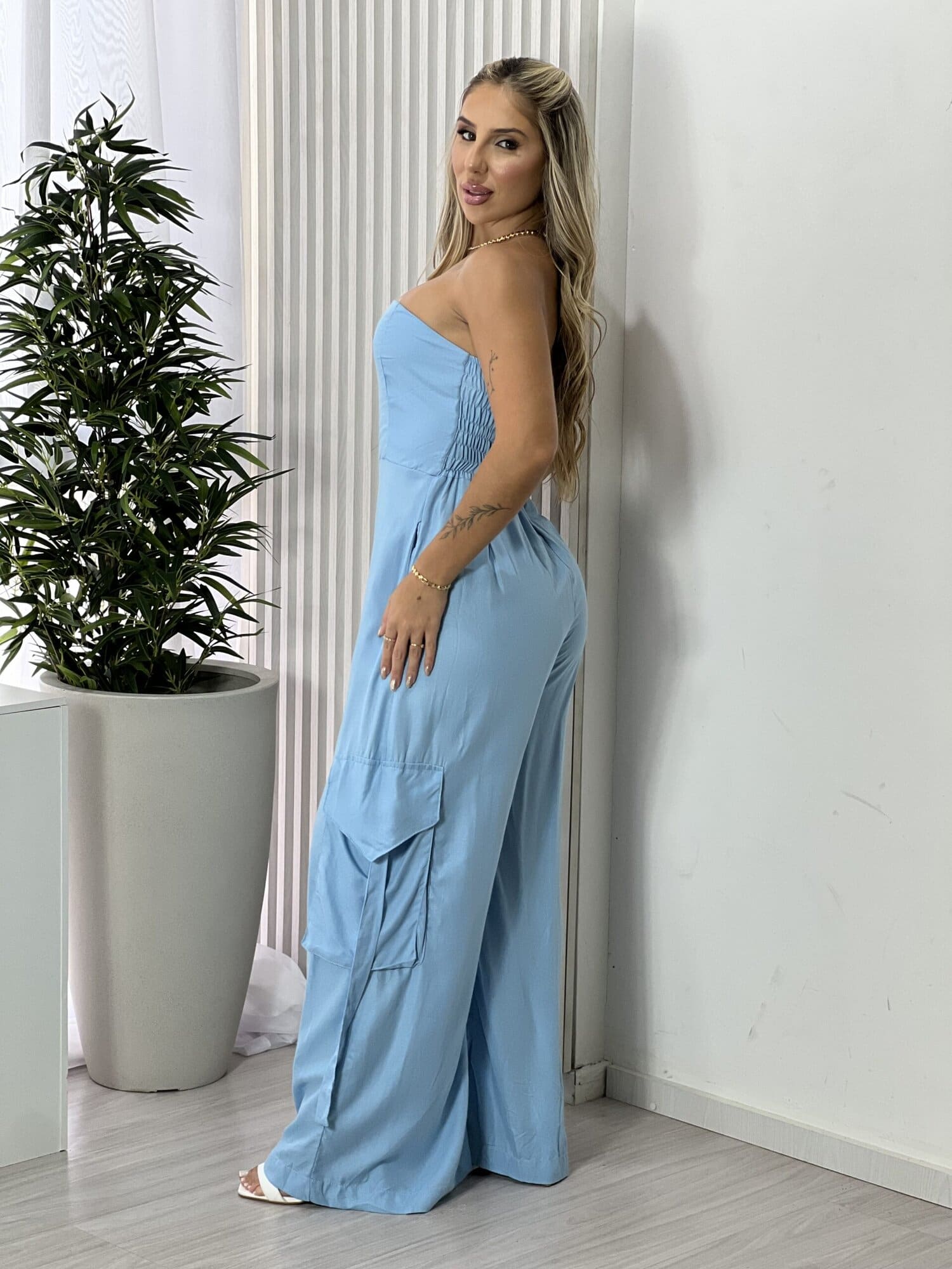 Com modelagem moderna, bolsos utilitários e caimento impecável, ele une o charme do tomara que caia ao toque descolado da tendência cargo. Perfeito para produções sofisticadas e cheias de personalidade.