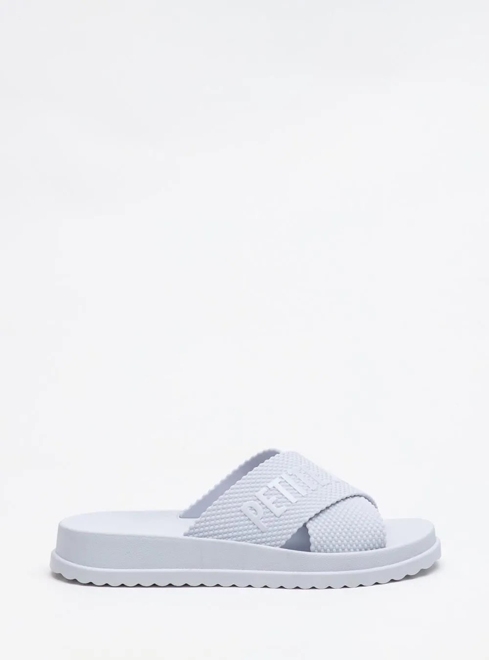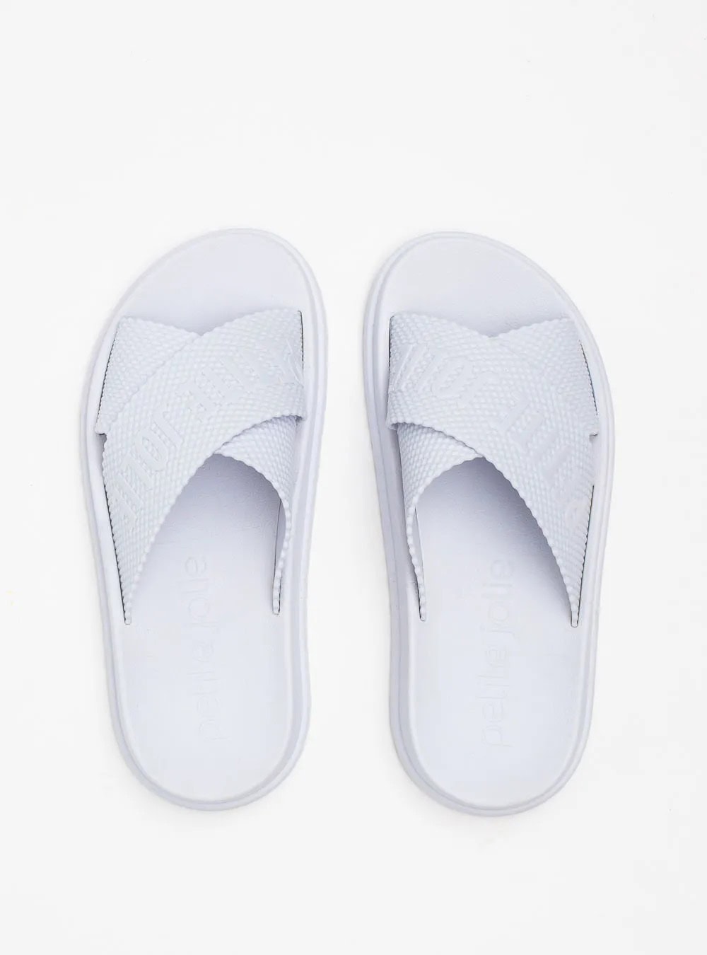 Chinelo J-Soft na cor azul gelato. Com design moderno e confortável, possui duas tiras largas cruzadas sobre o pé e aplicação do logo da marca em destaque. O solado é flatform, levemente tratorado, com shape anatômico que deixa os dedos e o calcanhar à mostra.