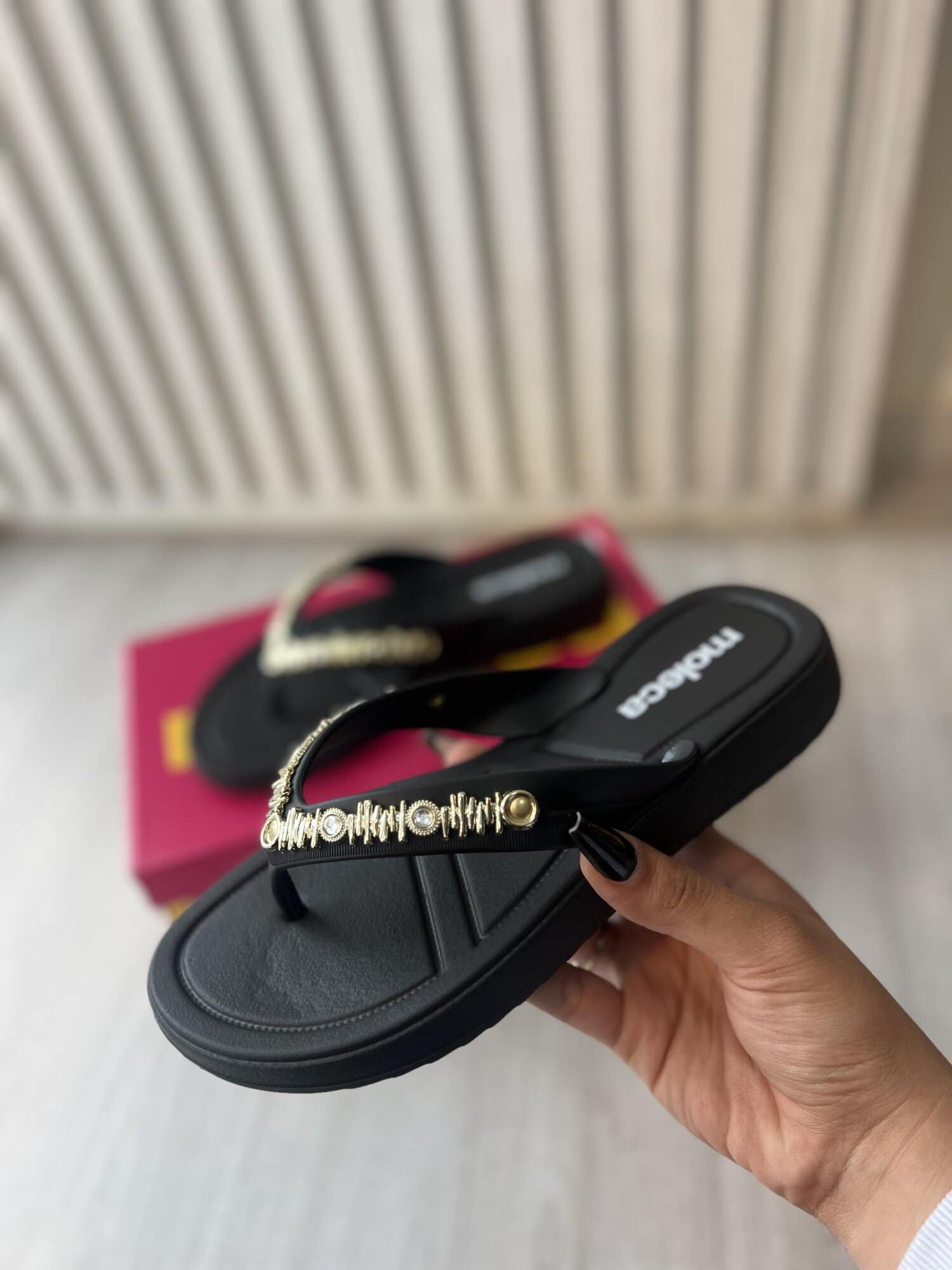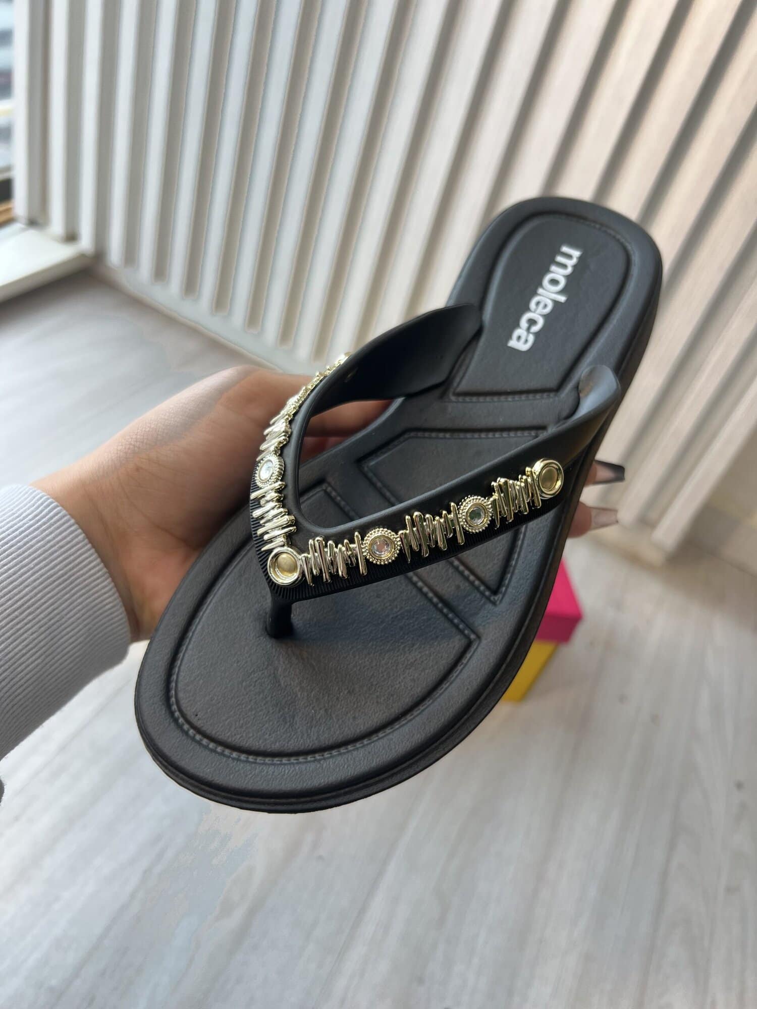 - tiras com detalhes de tachas e pedra com brilho;