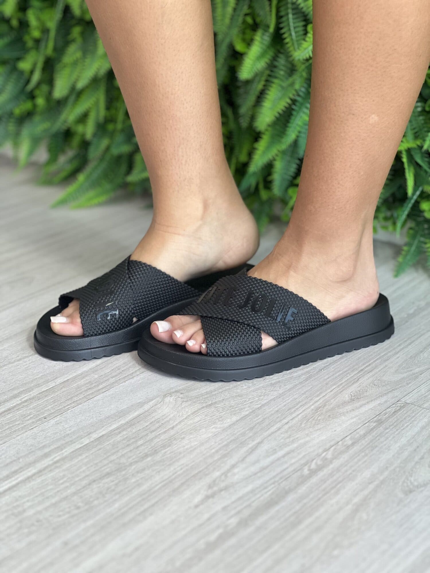Chinelo J-Soft na cor preto. Com design moderno e confortável, possui duas tiras largas cruzadas sobre o pé e aplicação do logo da marca em destaque. O solado é flatform, levemente tratorado, com shape anatômico que deixa os dedos e o calcanhar à mostra.