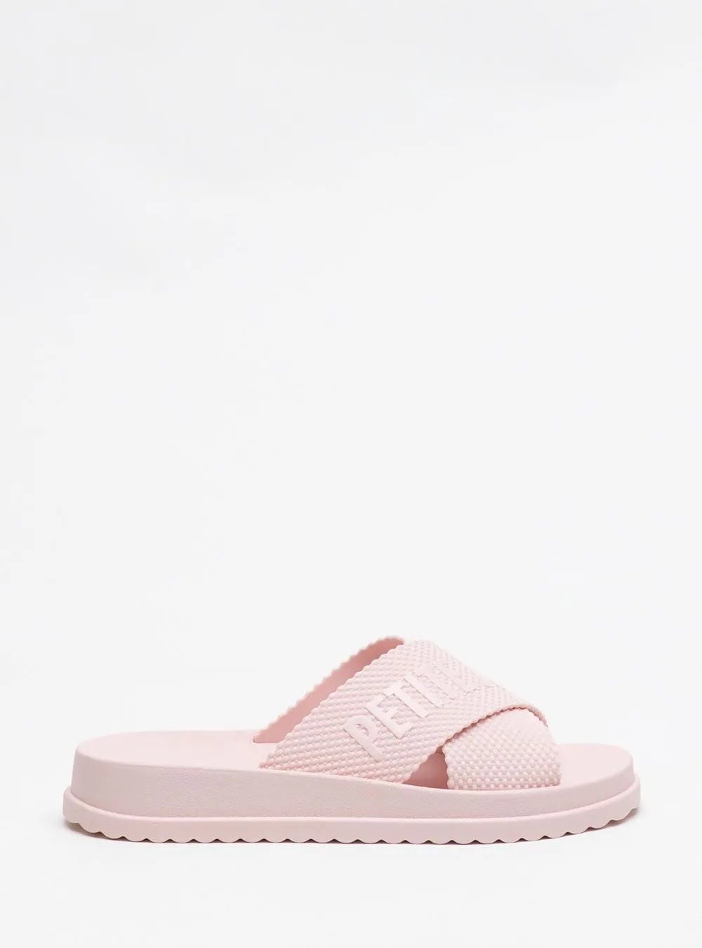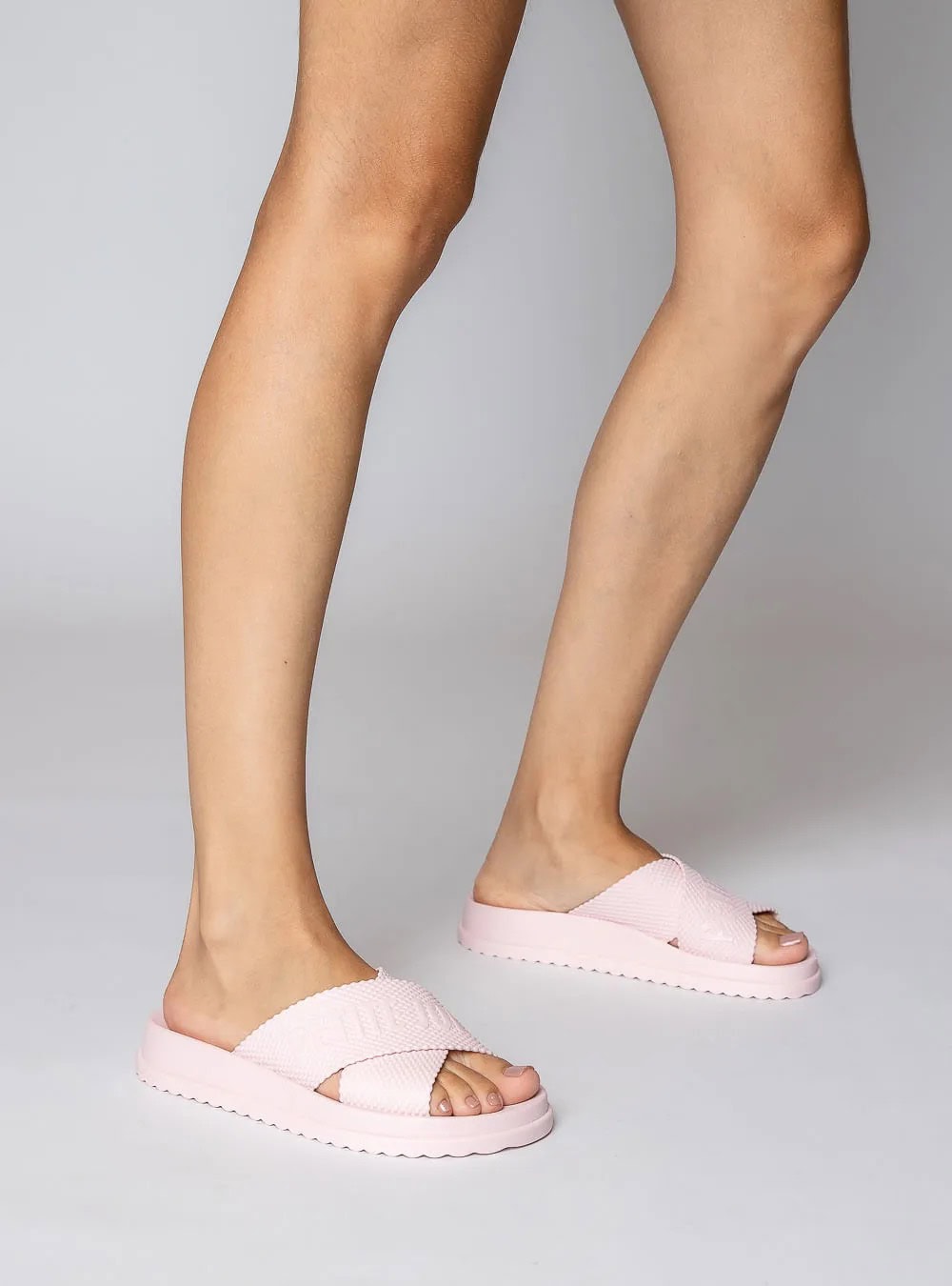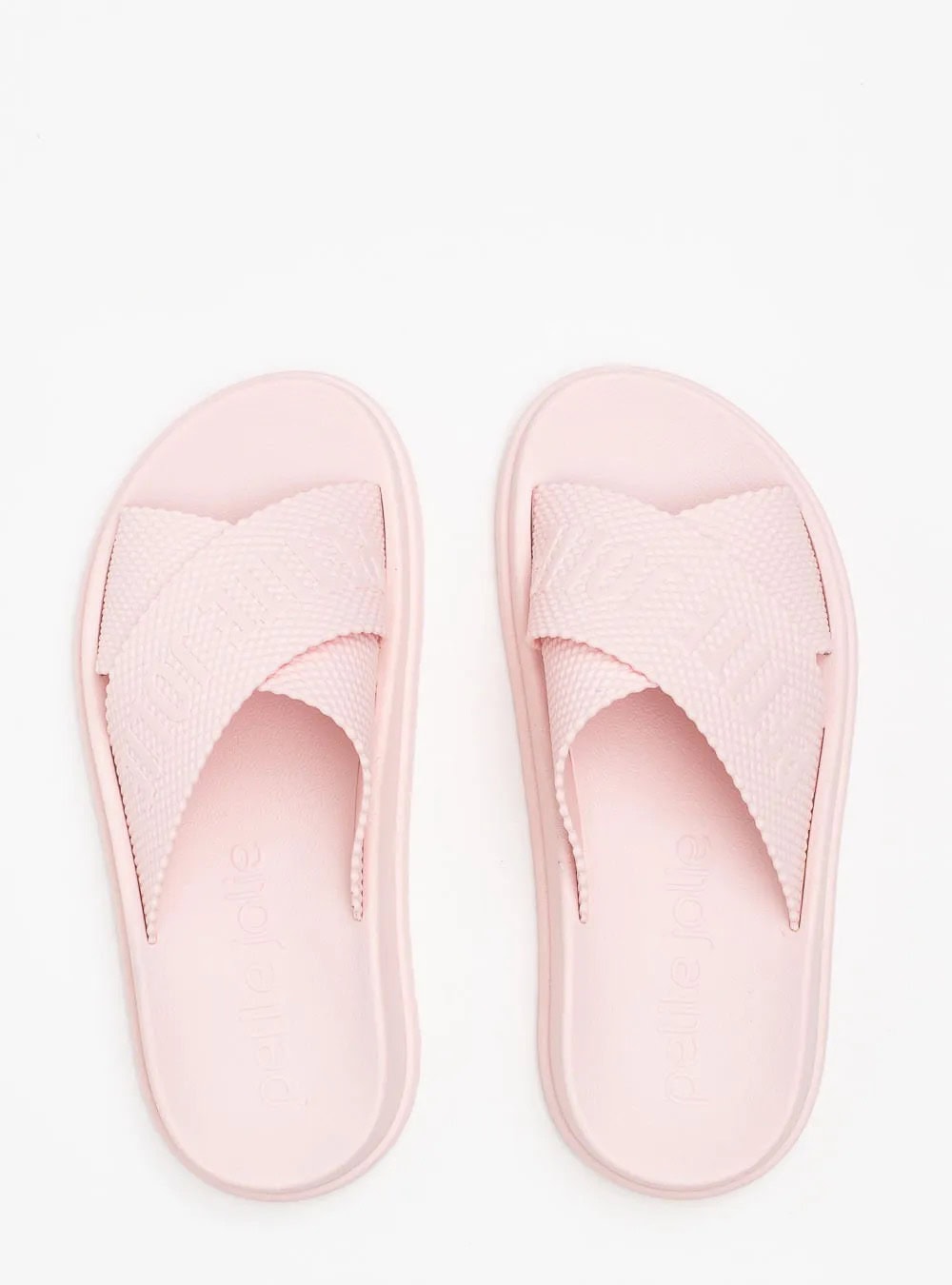 Chinelo J-Soft na cor rosa. Com design moderno e confortável, possui duas tiras largas cruzadas sobre o pé e aplicação do logo da marca em destaque. O solado é flatform, levemente tratorado, com shape anatômico que deixa os dedos e o calcanhar à mostra.