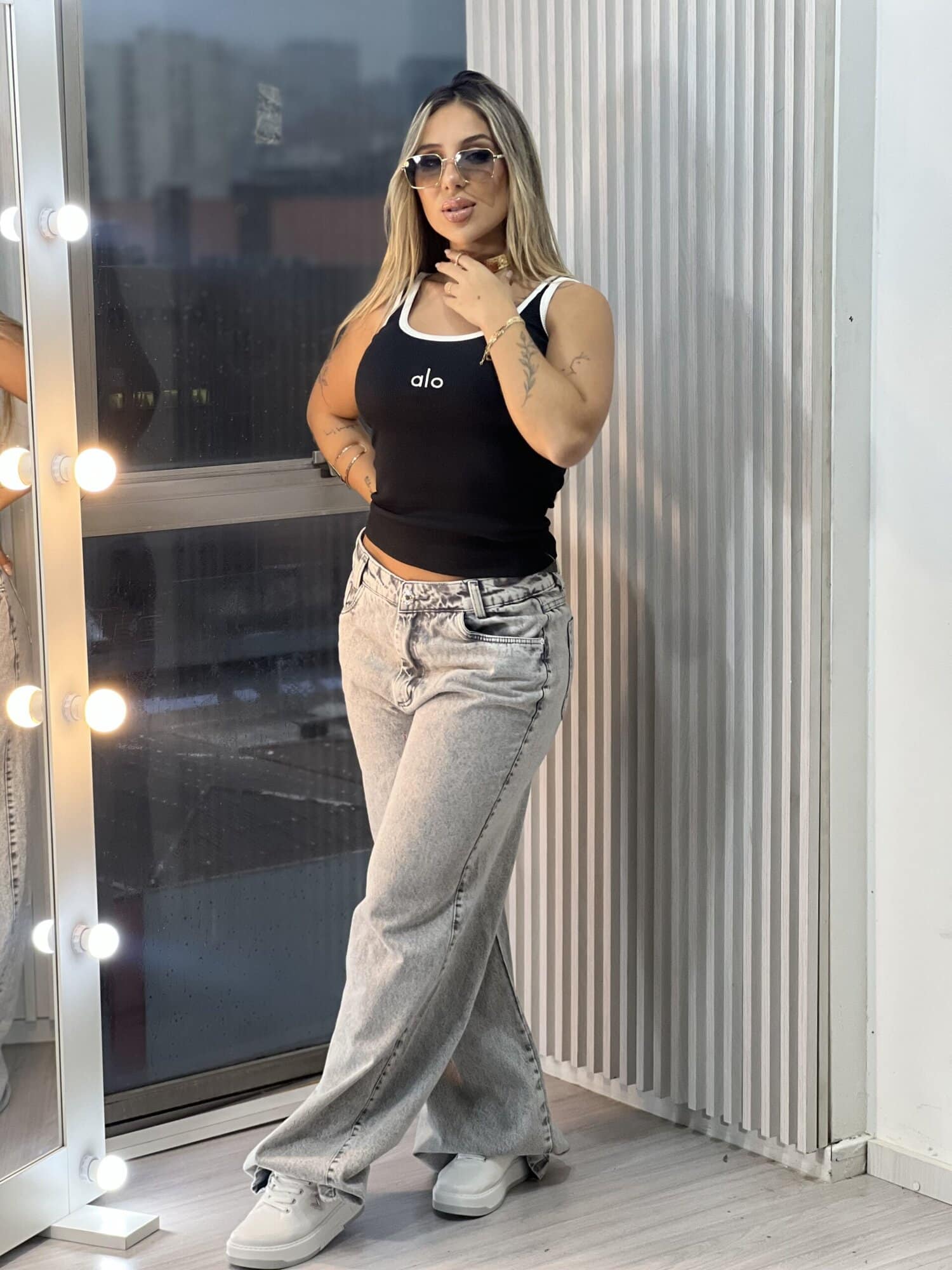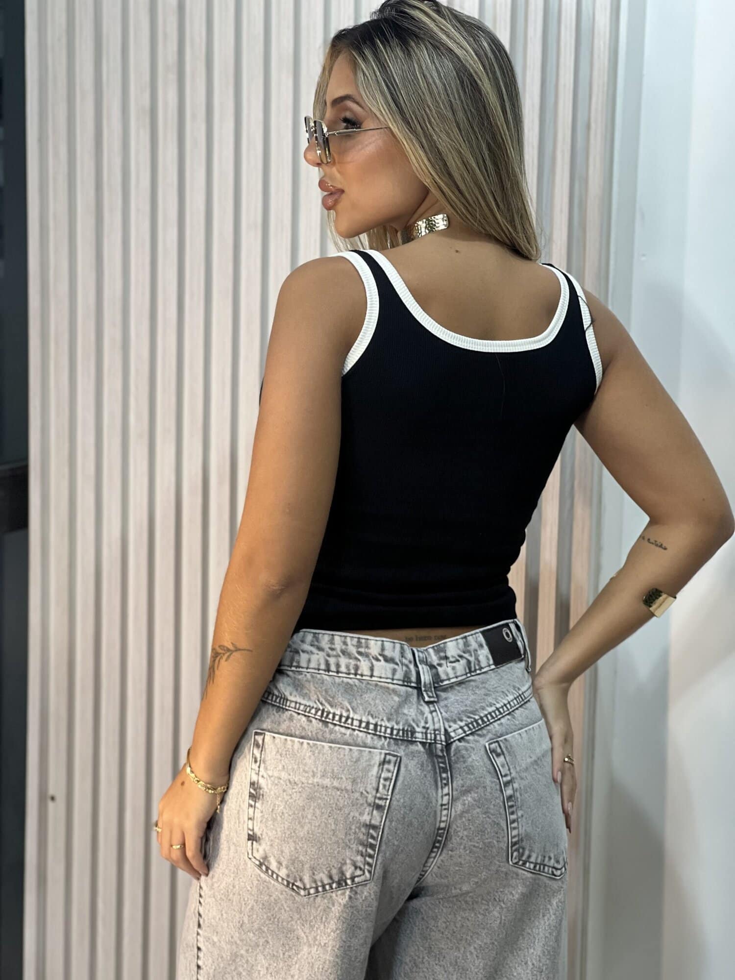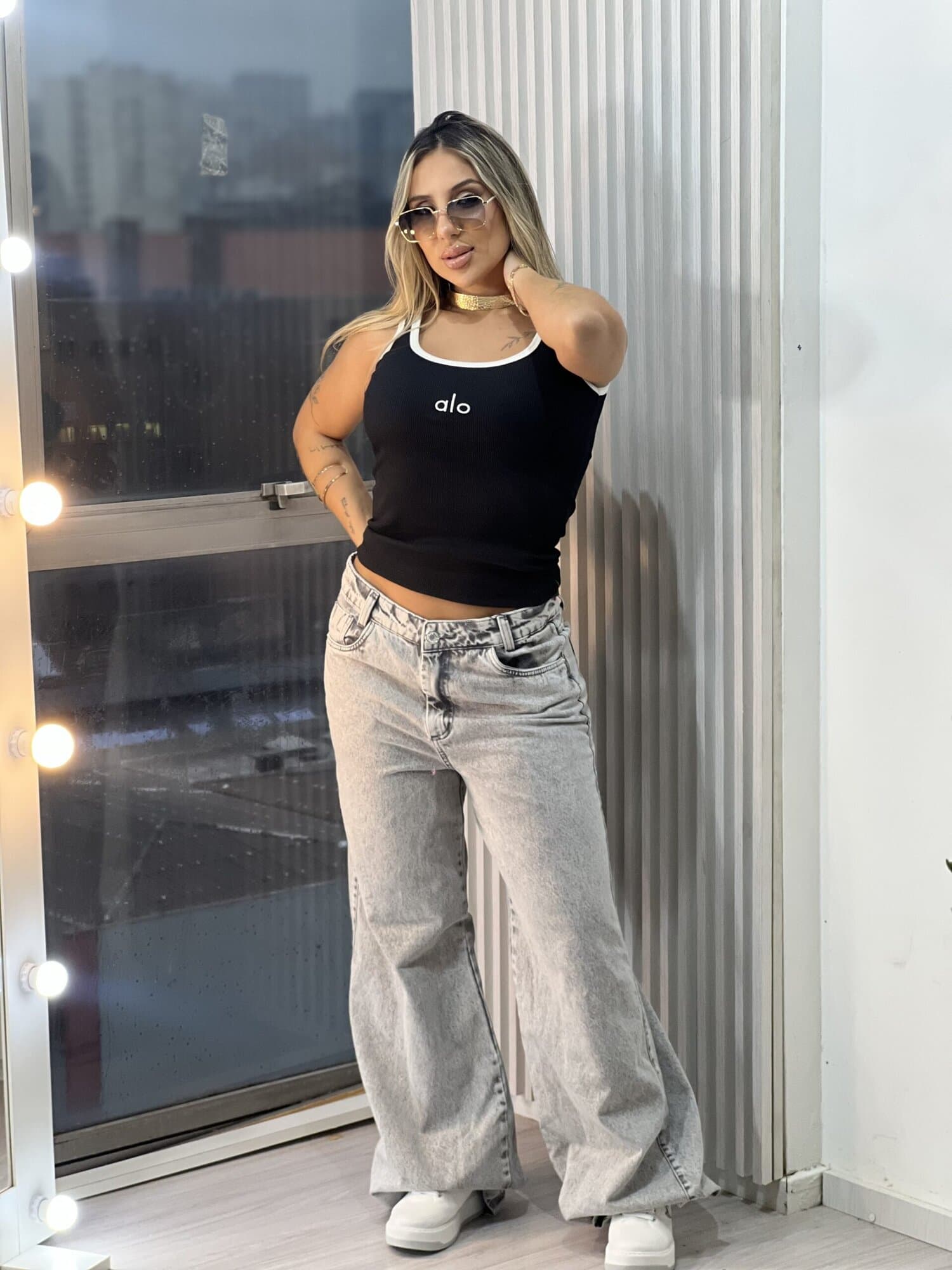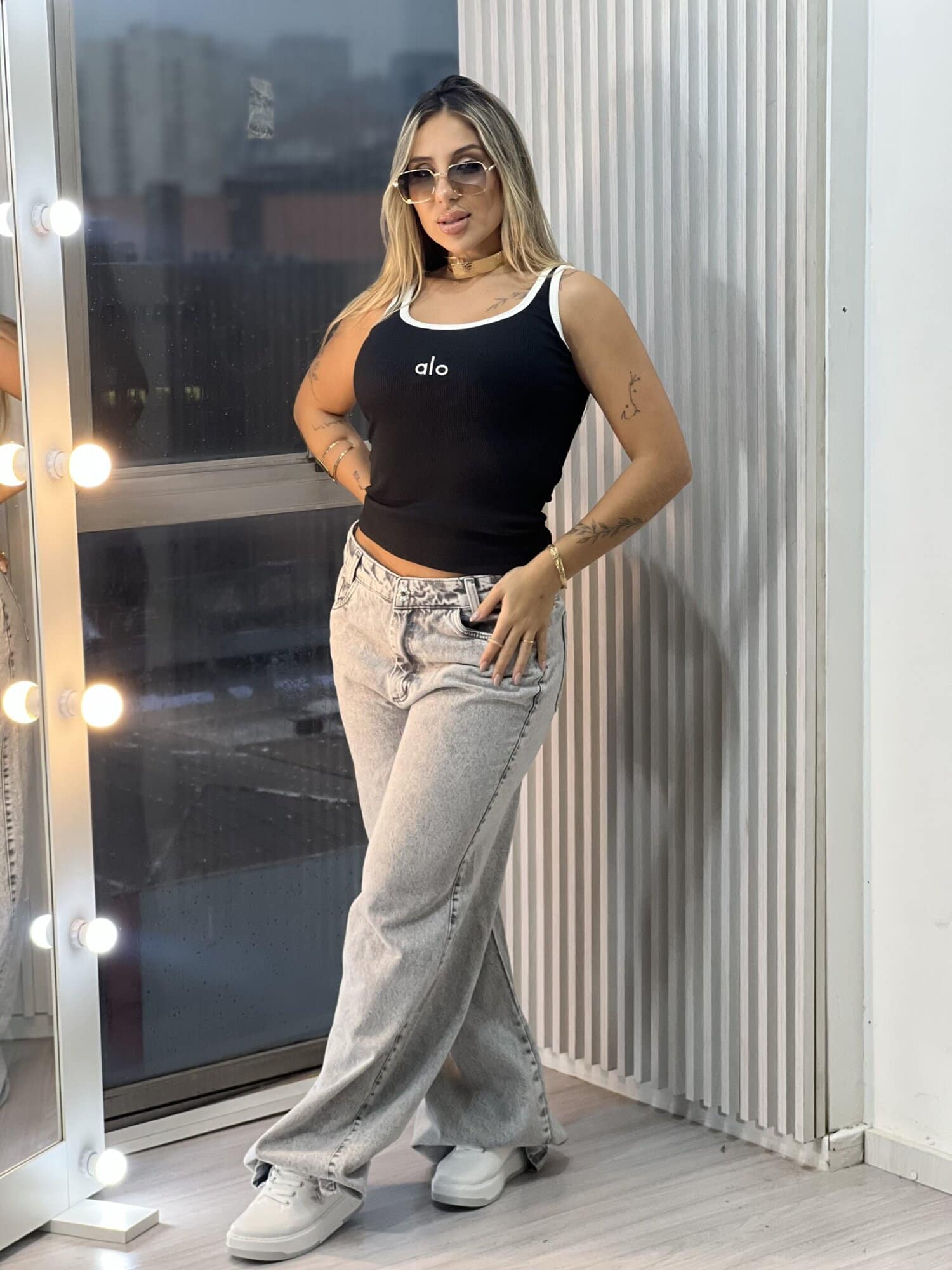 Regata confeccionada em tecido canelado de ribana, que garante conforto e ajuste perfeito ao corpo. Possui modelagem moderna, comprimento mais alongado e detalhe de bordado escrito na parte frontal, trazendo estilo e personalidade ao look. Ideal para compor produções casuais e despojadas.