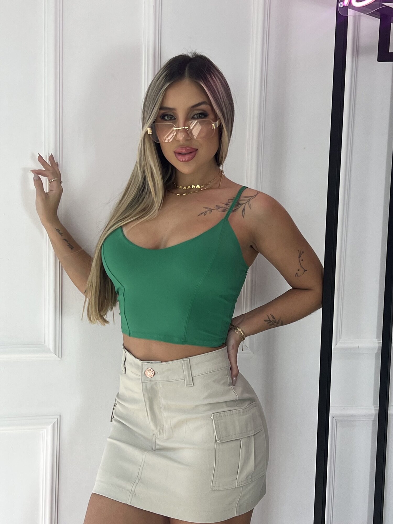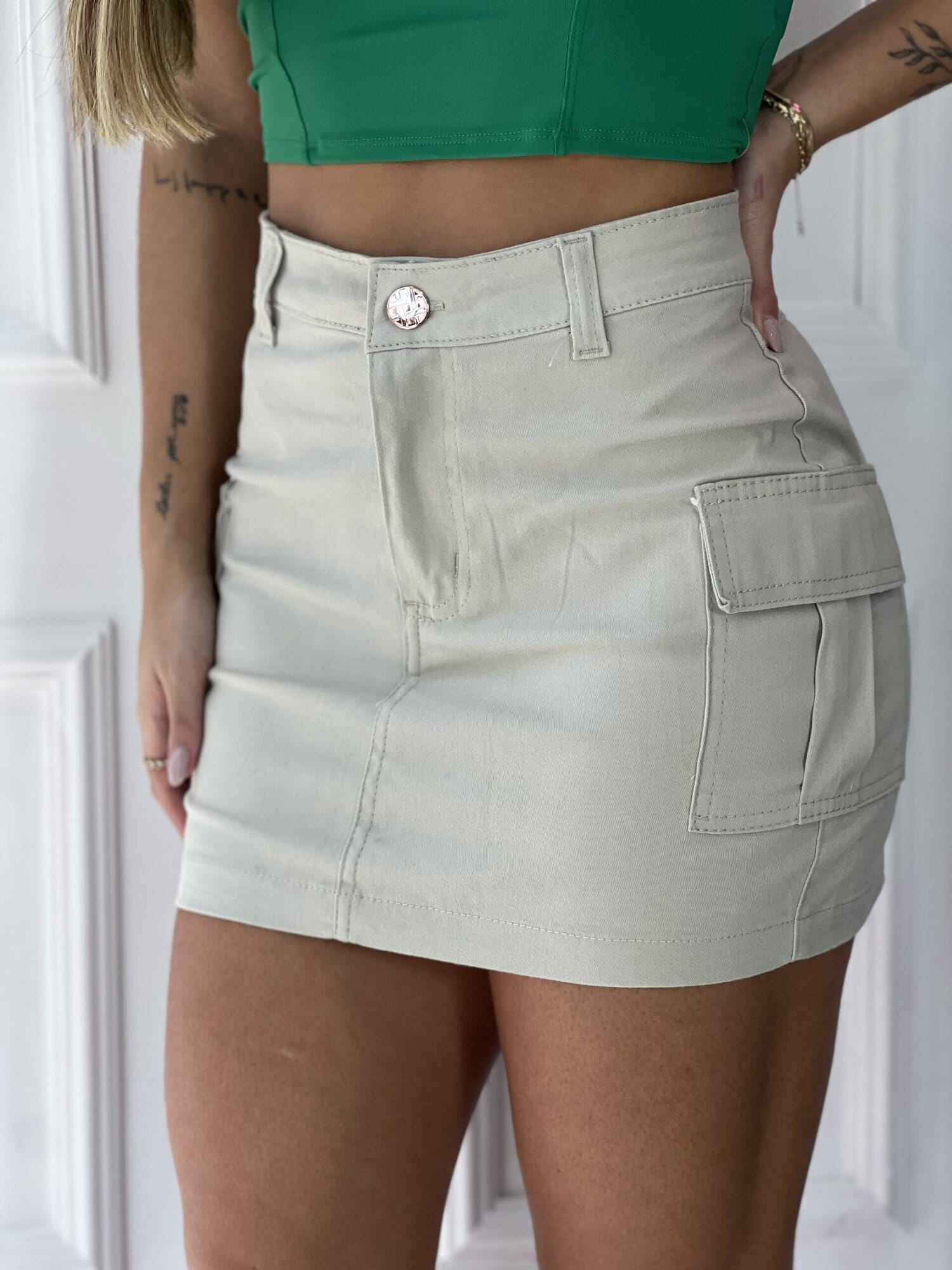 Uma saia super charmosa e que você pode combinar tanto com tênis, quanto sandálias, papetes, rasteiras… uma infinidade de opções, por isso você deve garantir esse modelo lindo de saia cargo.