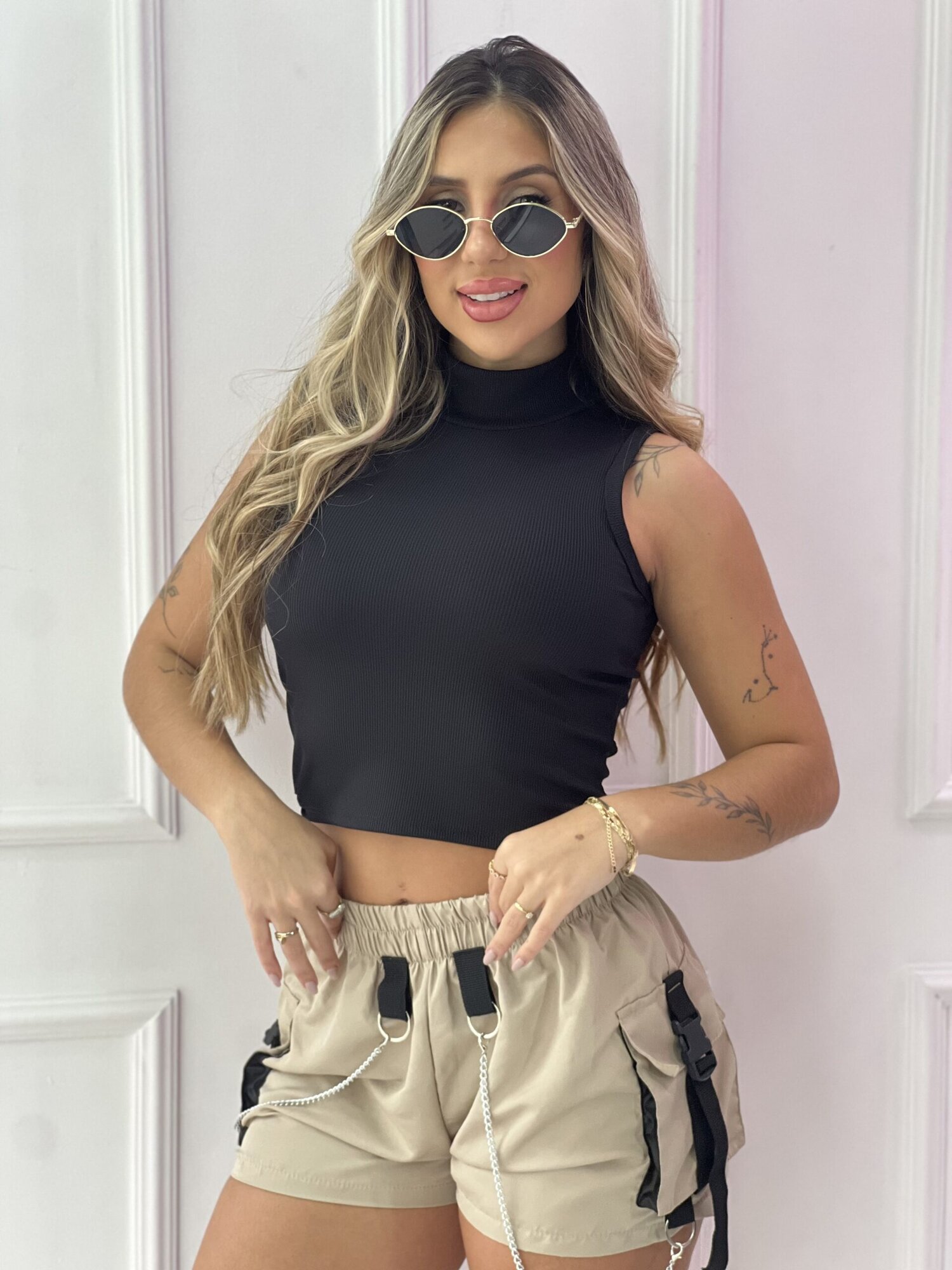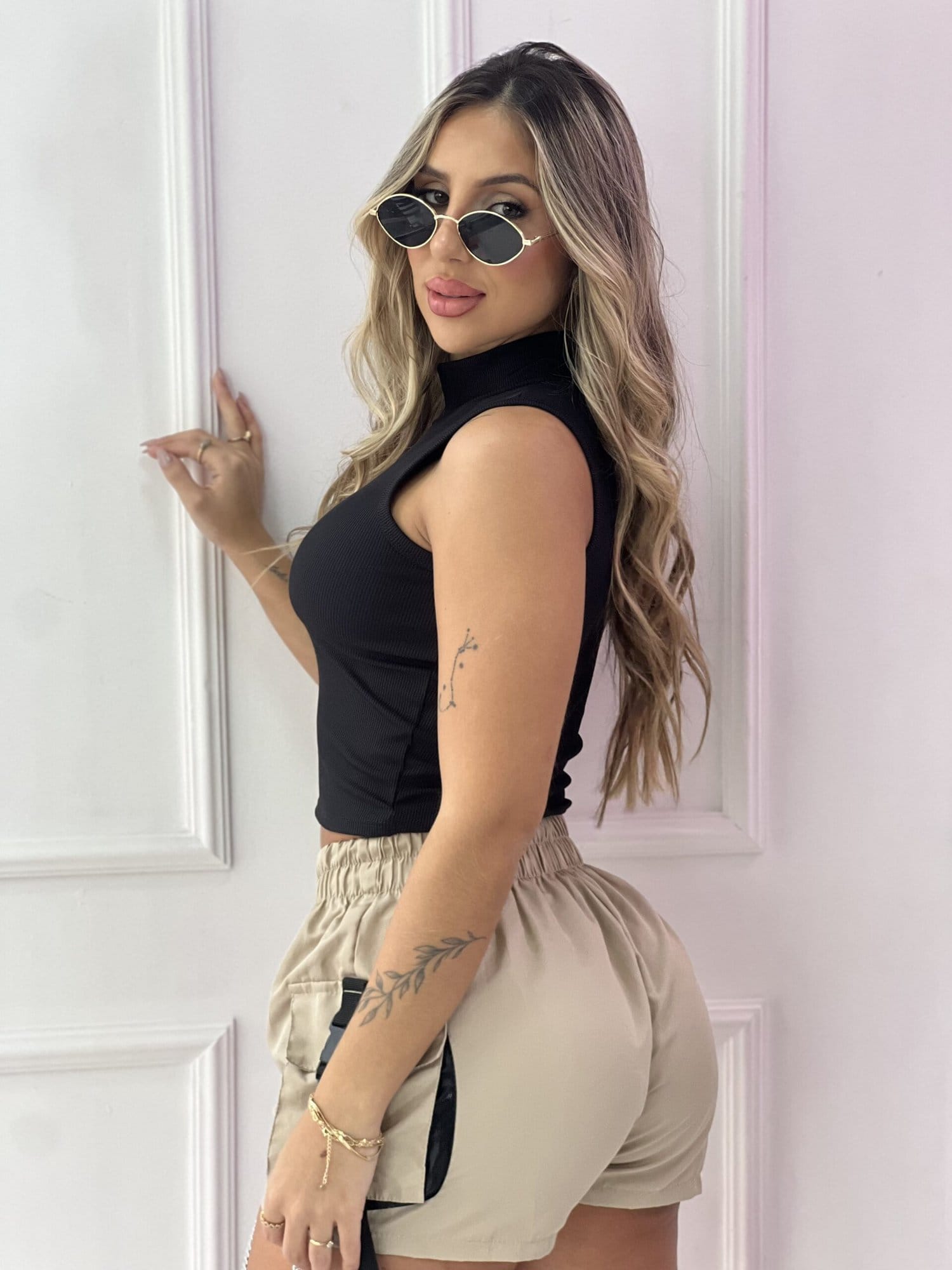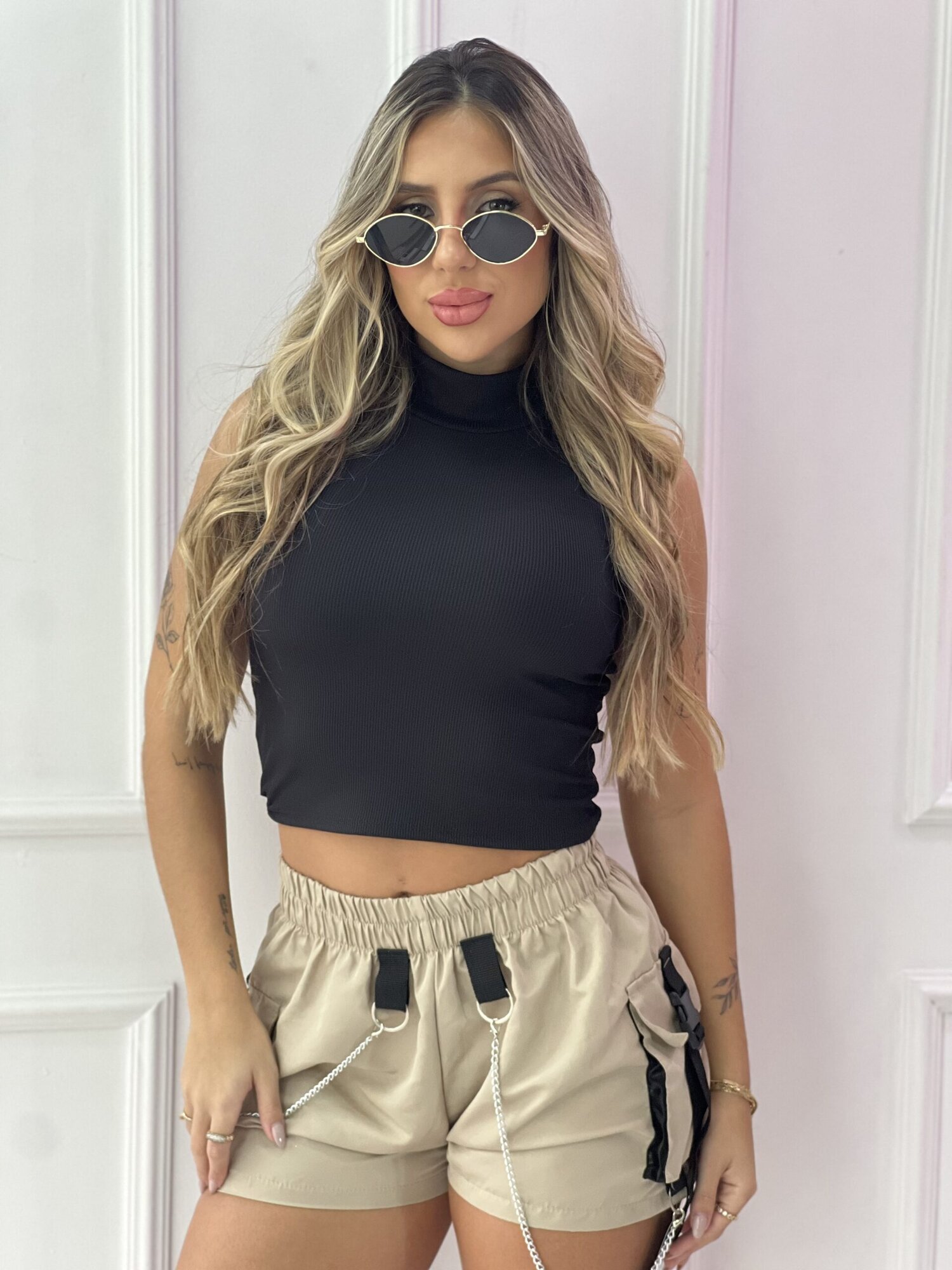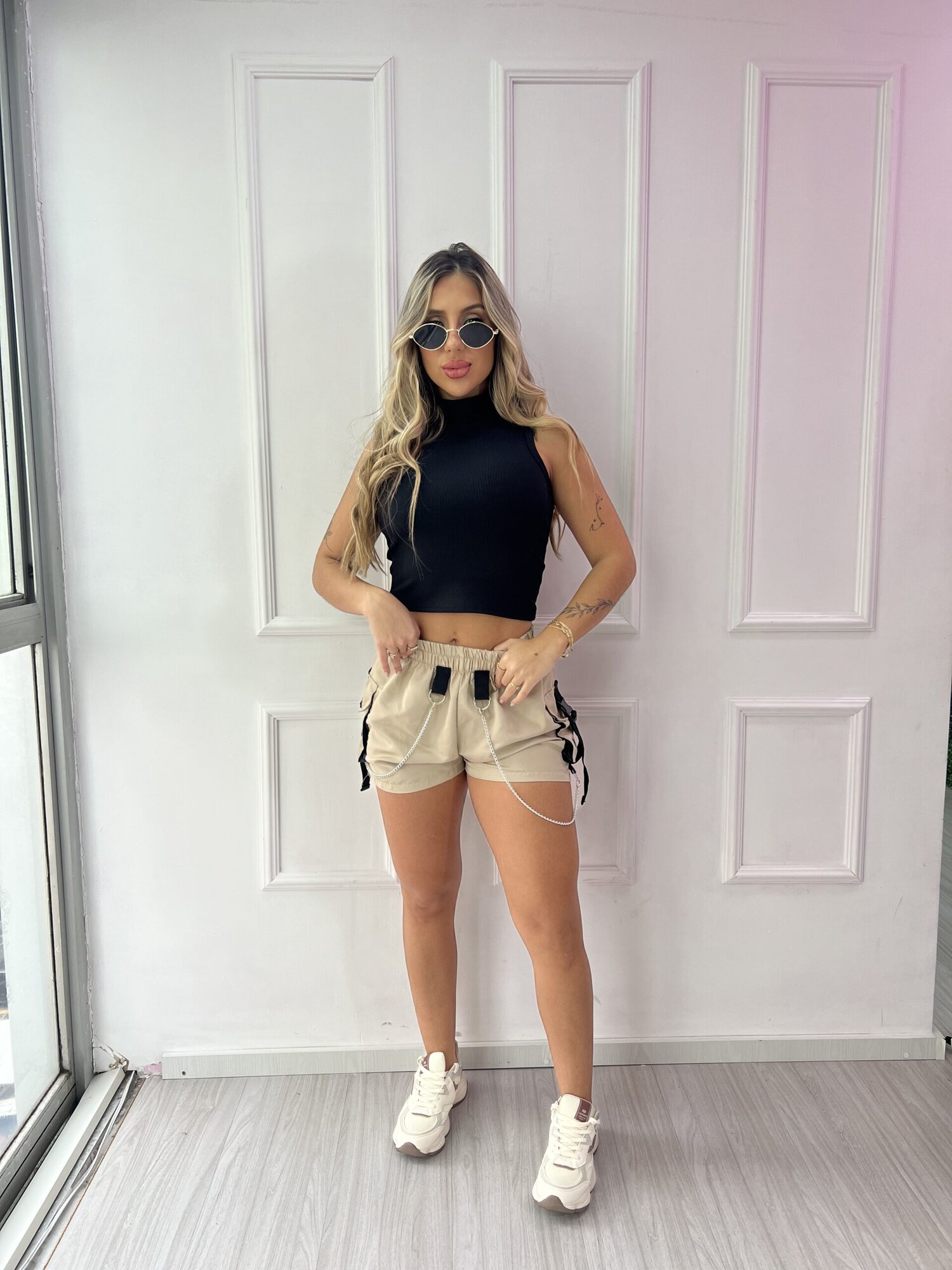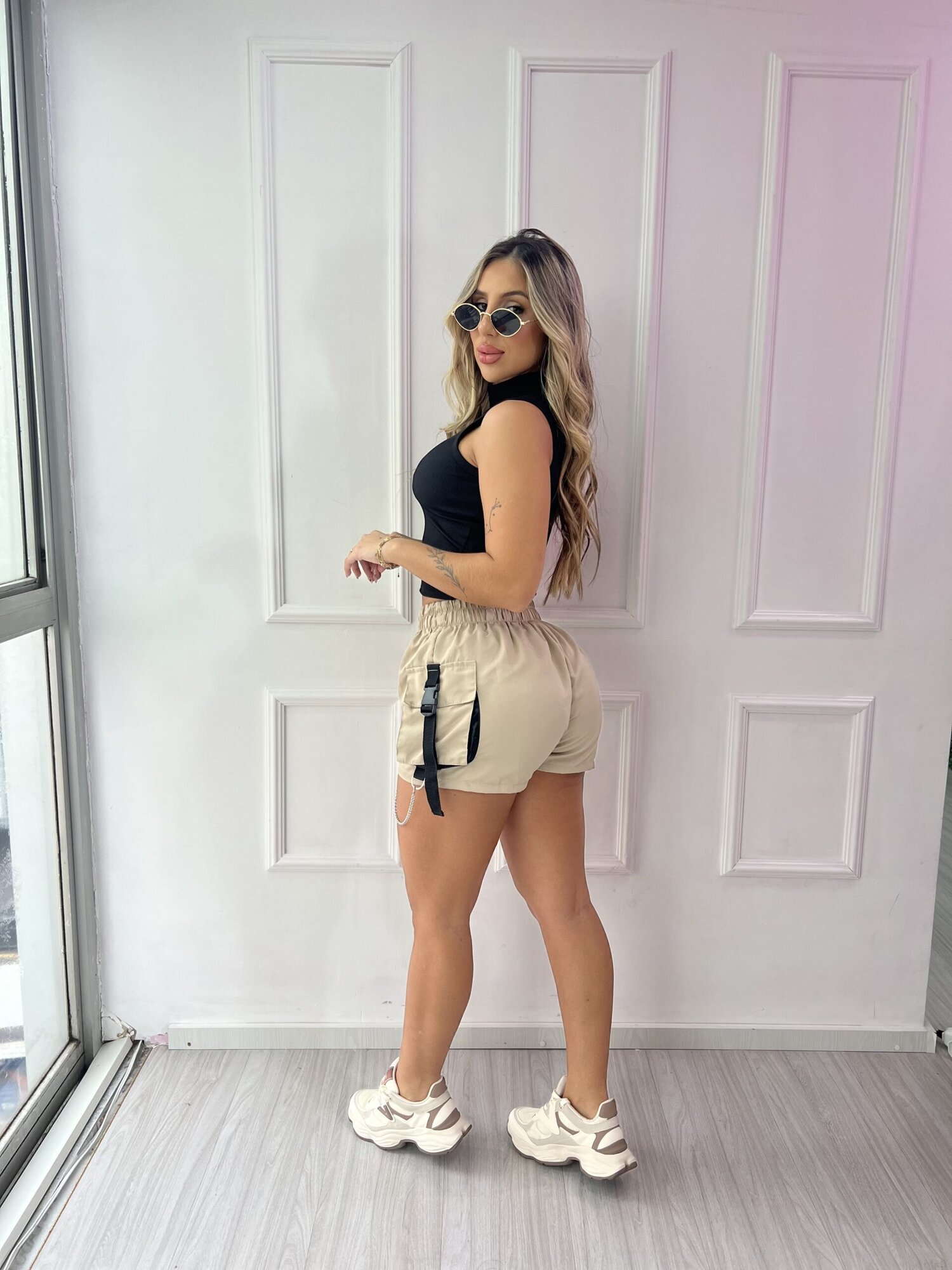 Short em tecido tactel, com detalhes em correntes pra deixar o seu look ainda mais estiloso.