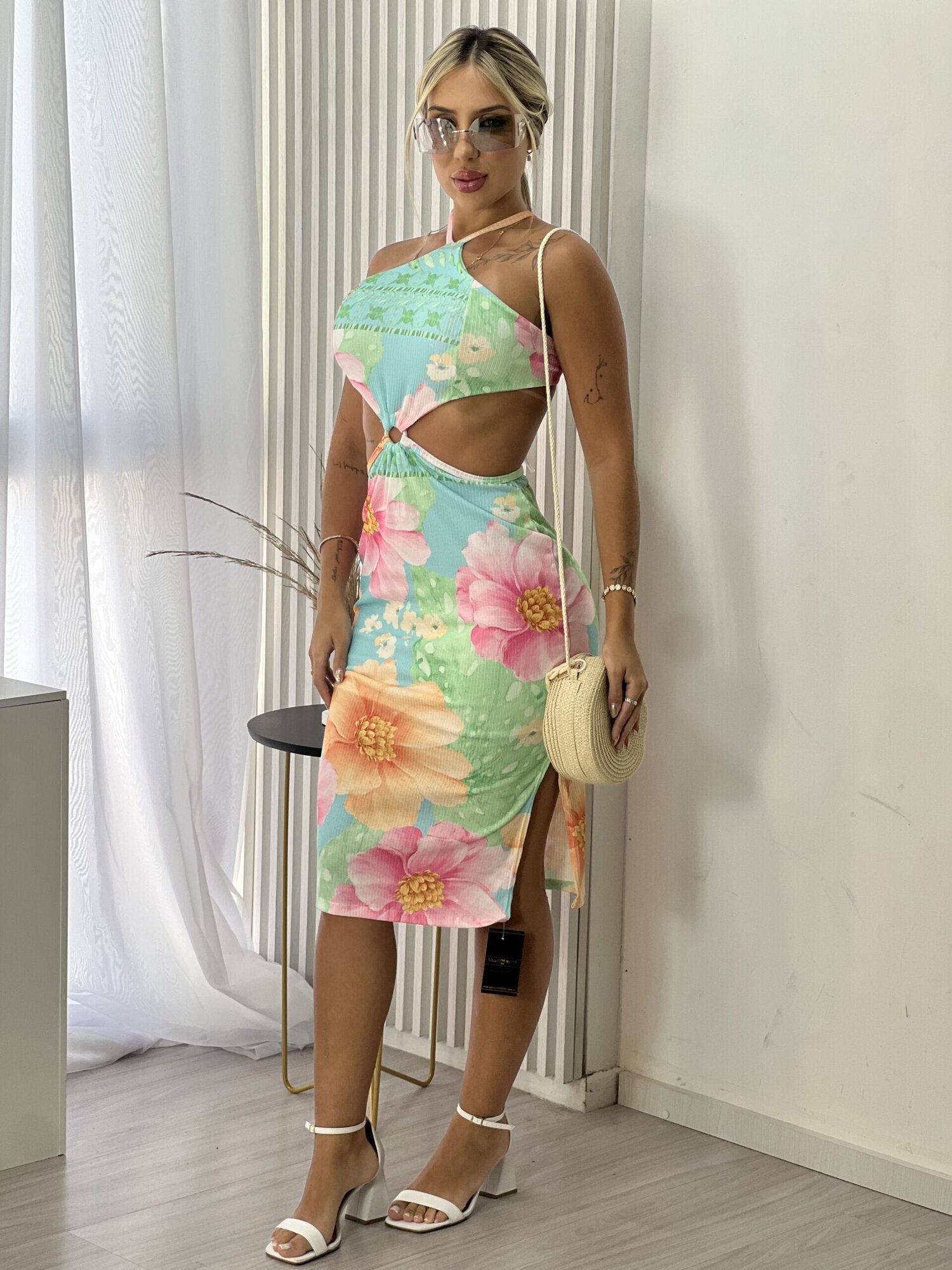 VESTIDO CANELADO MIDI ESTAMPADO LIZ FLOR ROSA