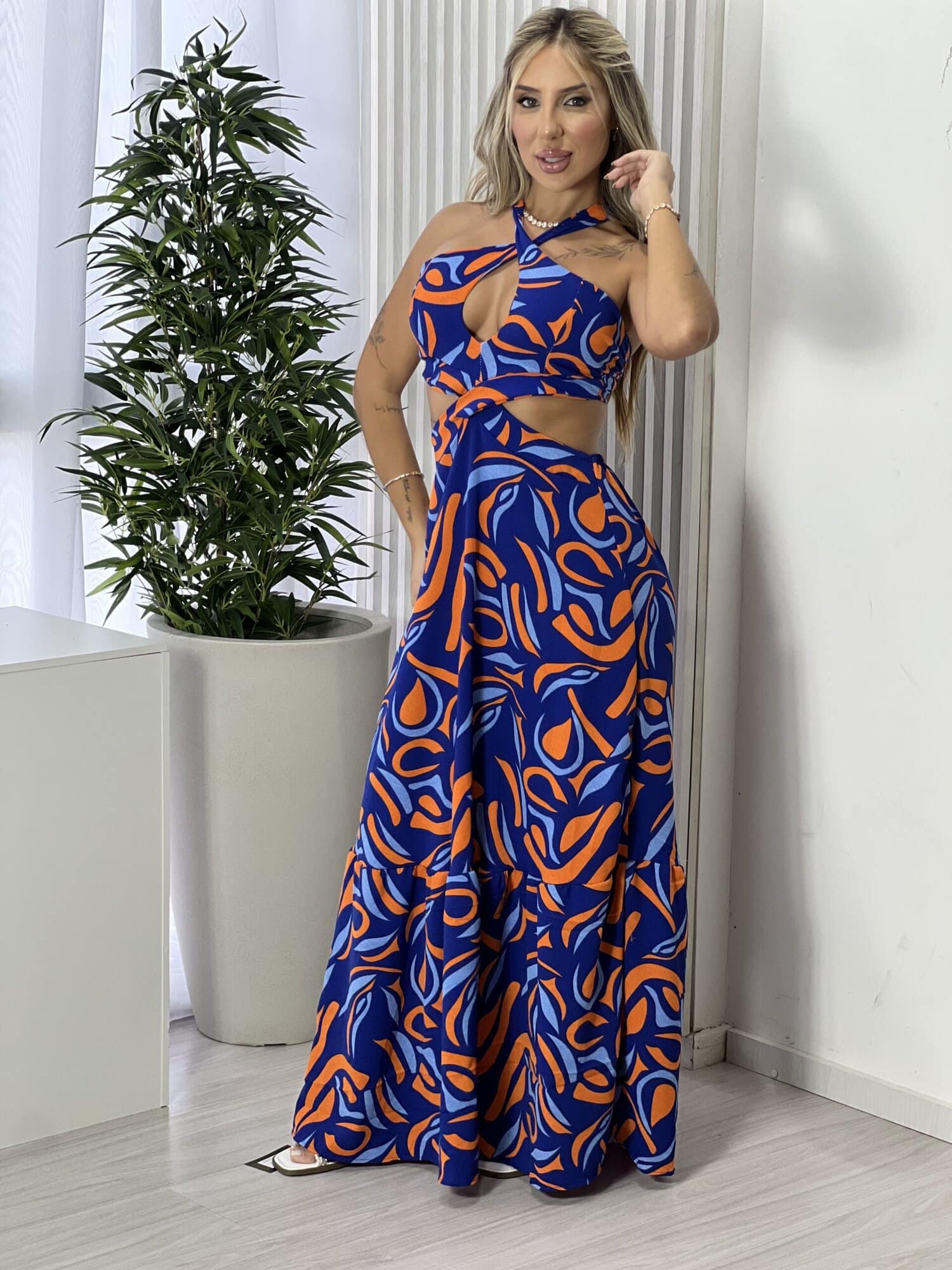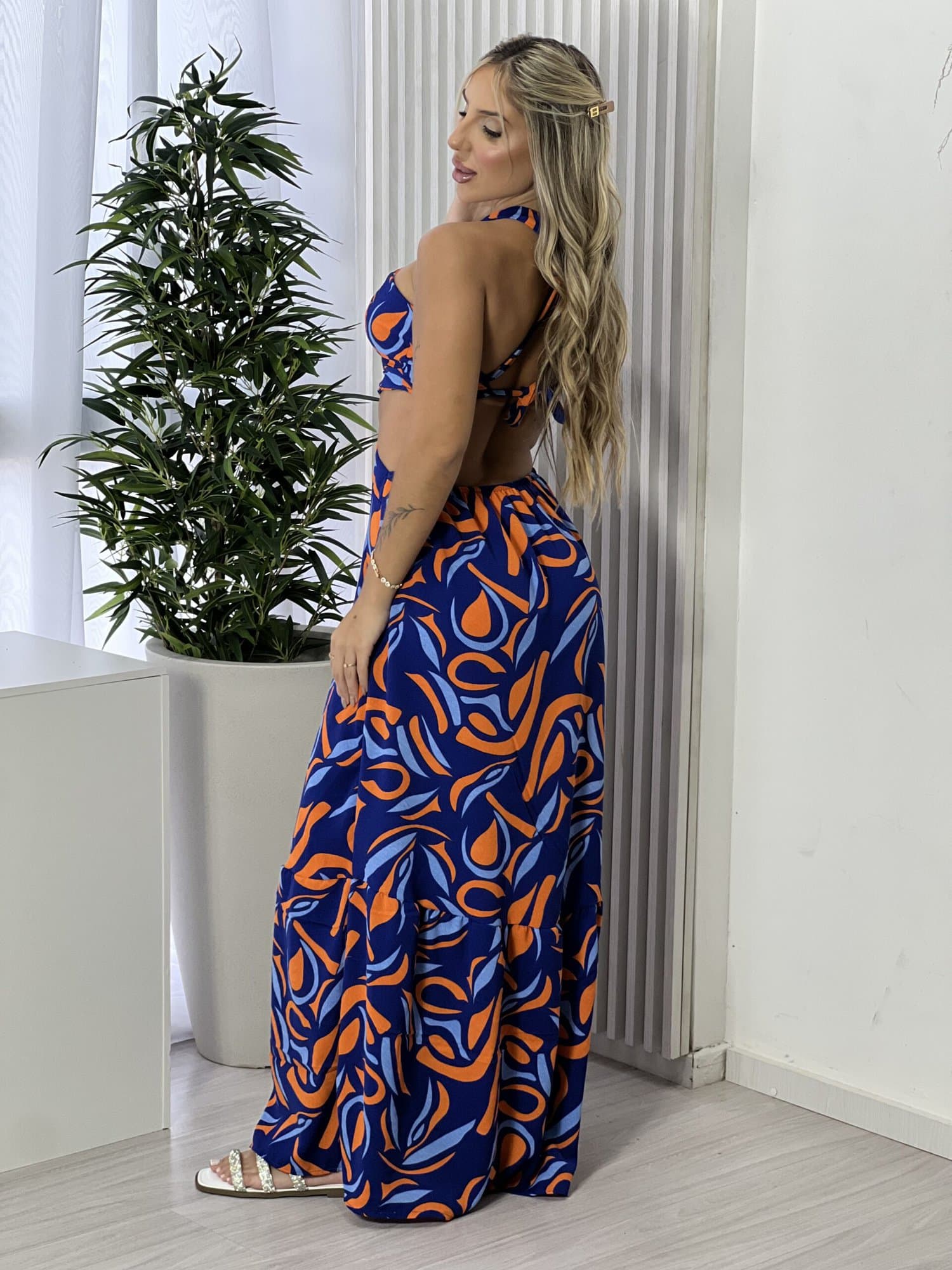 VESTIDO LONGO KAROLAINE ESTAMPADO AZUL E LARANJA